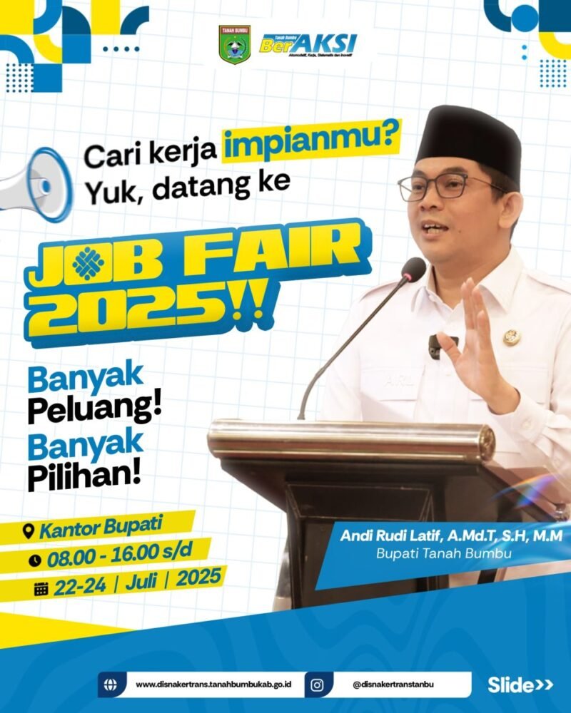 KALIMANTANVIEW.COM, TANAH BUMBU– Pemerintah Kabupaten Tanah Bumbu kembali menunjukkan komitmennya terhadap peningkatan kesejahteraan masyarakat melalui pelaksanaan Job Fair 2025 yang digelar selama tiga hari, 22–24 Juli 2025, bertempat di Halaman Kantor Bupati Tanah Bumbu, mulai pukul 08.00 hingga 16.00 WITA.