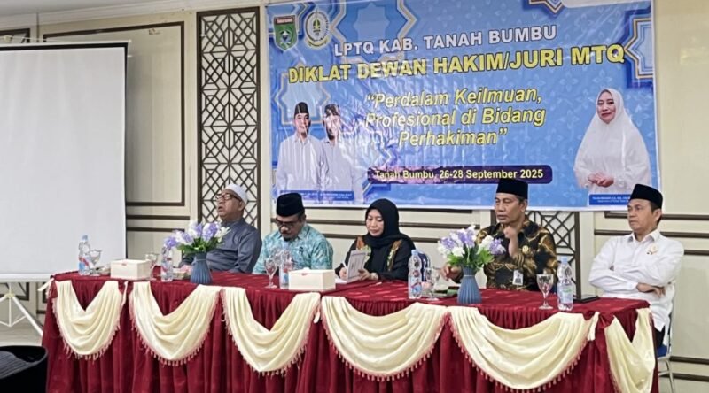 KALIMANTANVIEW.COM, TANAH BUMBU – Dalam pembukaan Diklat Dewan Hakim MTQ Tanah Bumbu Tahun 2025 yang digelar di Hotel Medina, Kecamatan Kusan Hilir, Jumat (26/9/2025), Bupati Andi Rudi Latif melalui Sekretaris Daerah Yulian Herawati menyampaikan bahwa majelis perhakiman bukan hanya lembaga penilai, tetapi juga bagian dari dakwah yang menyiarkan dan menghidupkan nilai-nilai Al-Qur’an.